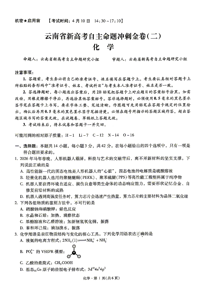 云南省新高考自主命题冲刺金卷(二)化学试题(含答案).pdf