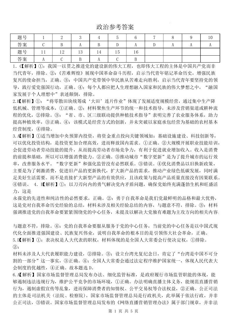 山西大学附属中学校2026届高三下学期4月阶段检测 政治答案.docx