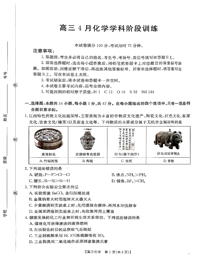 江西“三新”协同教研共同体2026届高三4月学科阶段训练 化学.pdf