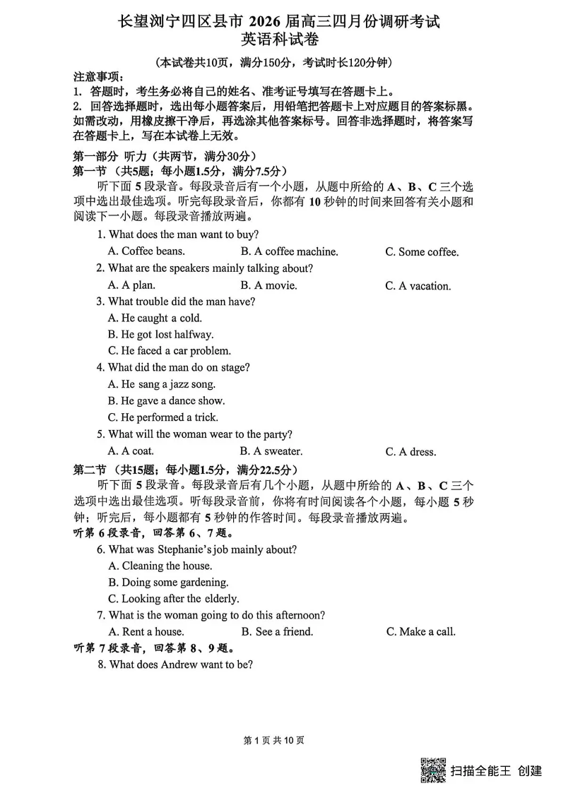长望浏宁四区县市2026届高三四月份调研考试 英语.pdf