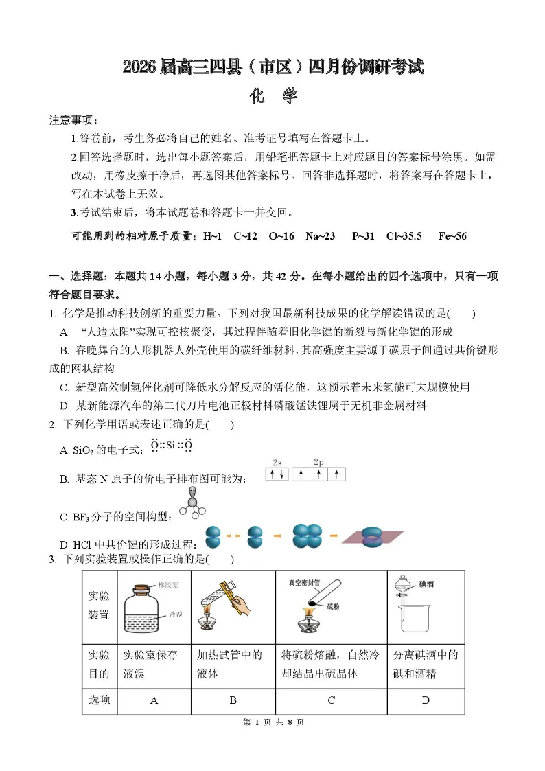 长望浏宁四区县市2026届高三四月份调研考试 化学.pdf