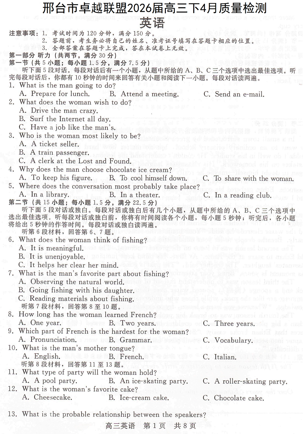 邢台市卓越联盟2026届高三下4月质量检测 英语.pdf