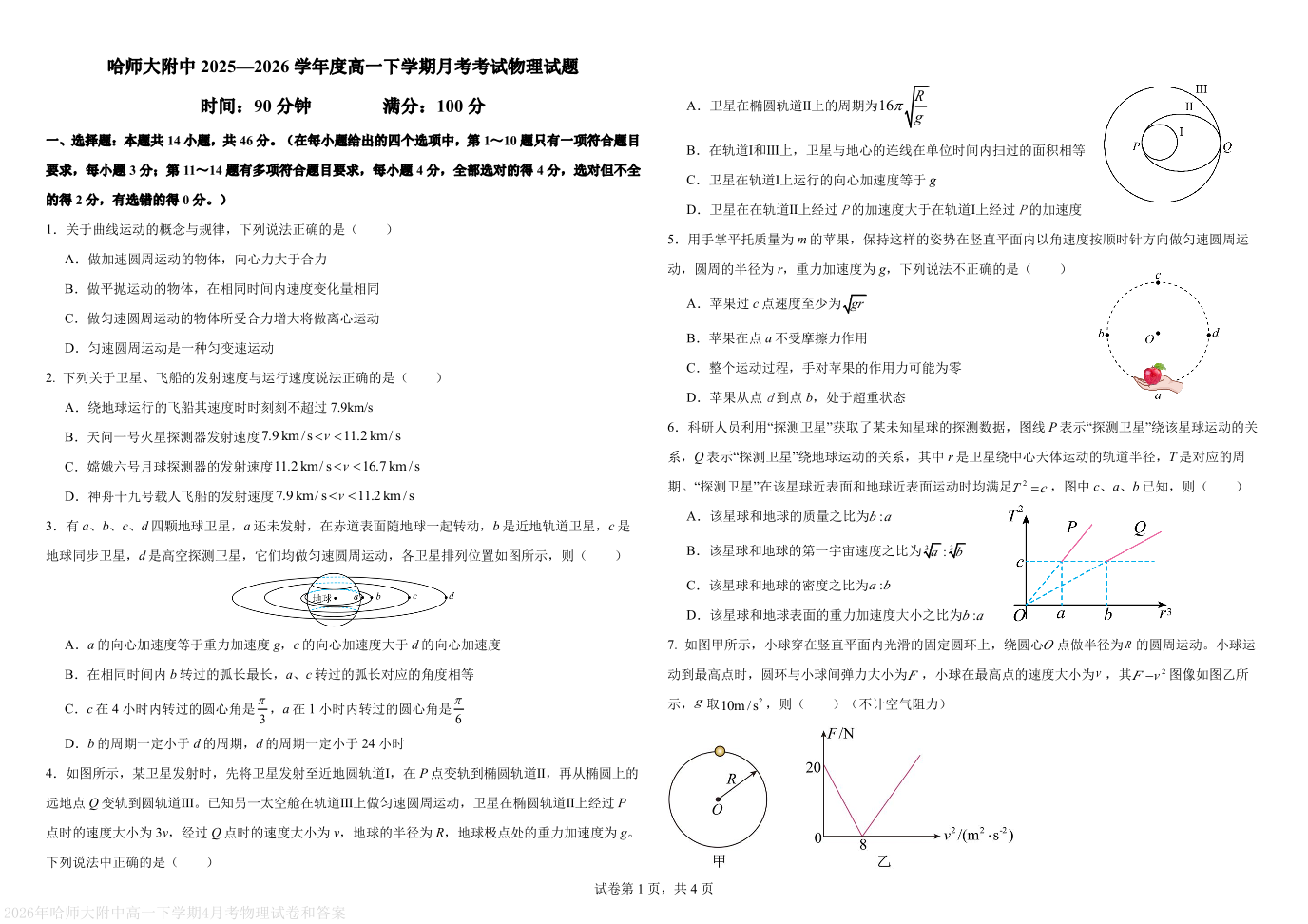哈尔滨师范大学附属中学2025-2026学年高一下学期4月月考 物理试题(含答案).pdf