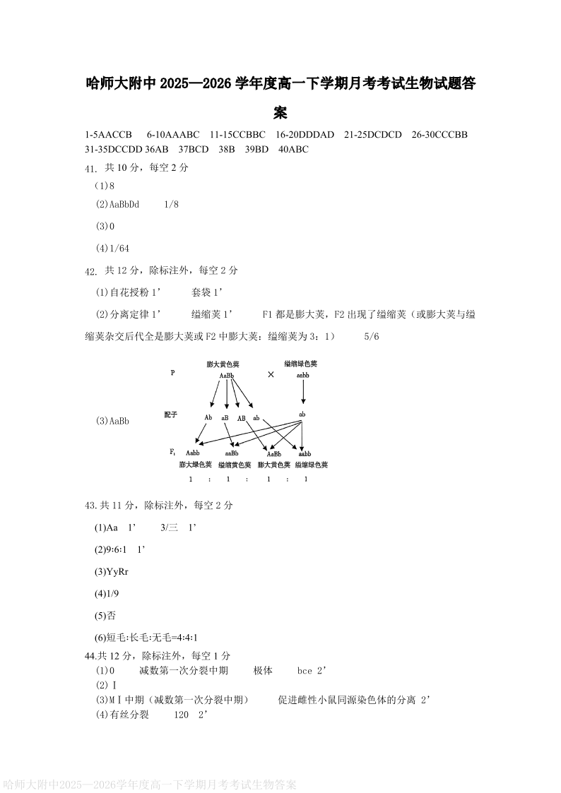 哈尔滨师范大学附属中学2025-2026学年高一下学期4月月考 生物答案.pdf
