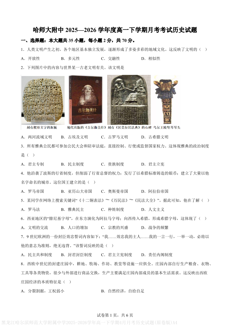 哈尔滨师范大学附属中学2025-2026学年高一下学期4月月考 历史.pdf