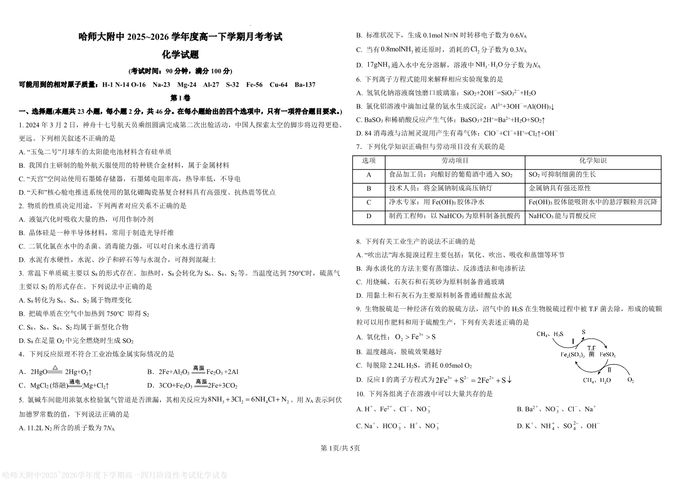 哈尔滨师范大学附属中学2025-2026学年高一下学期4月月考 化学.pdf