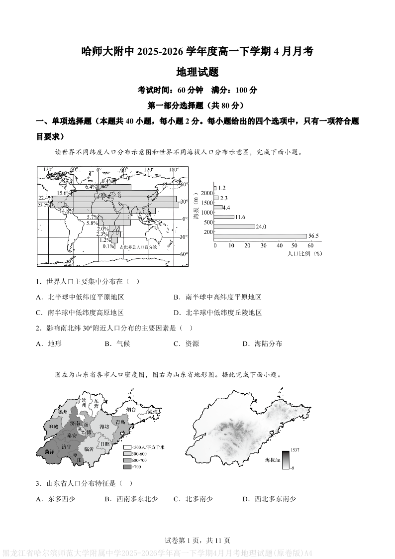 哈尔滨师范大学附属中学2025-2026学年高一下学期4月月考 地理.pdf