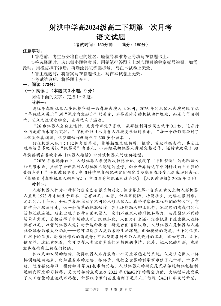 四川省遂宁市射洪中学2025-2026学年高二下学期第一次月考 语文.docx