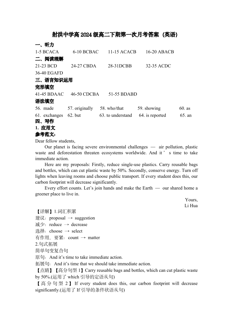 四川省遂宁市射洪中学2025-2026学年高二下学期第一次月考 英语答案.pdf