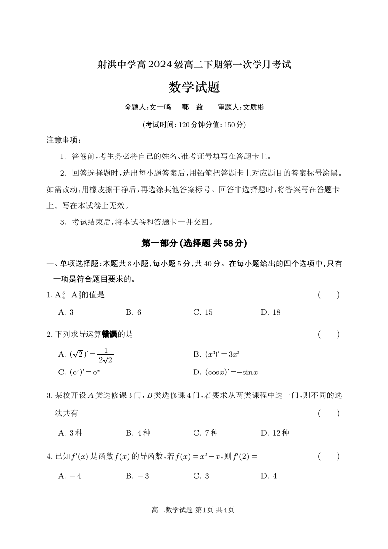 四川省遂宁市射洪中学2025-2026学年高二下学期第一次月考 数学.pdf