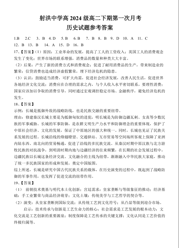 四川省遂宁市射洪中学2025-2026学年高二下学期第一次月考 历史答案.docx