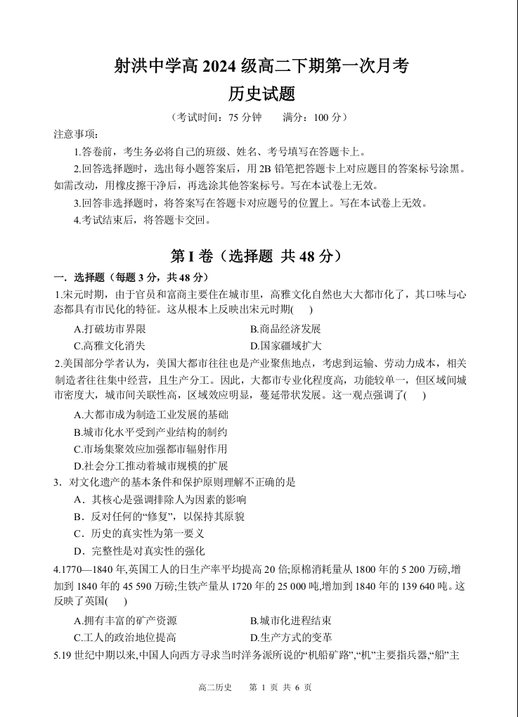 四川省遂宁市射洪中学2025-2026学年高二下学期第一次月考 历史.docx