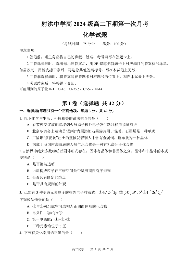四川省遂宁市射洪中学2025-2026学年高二下学期第一次月考 化学.docx