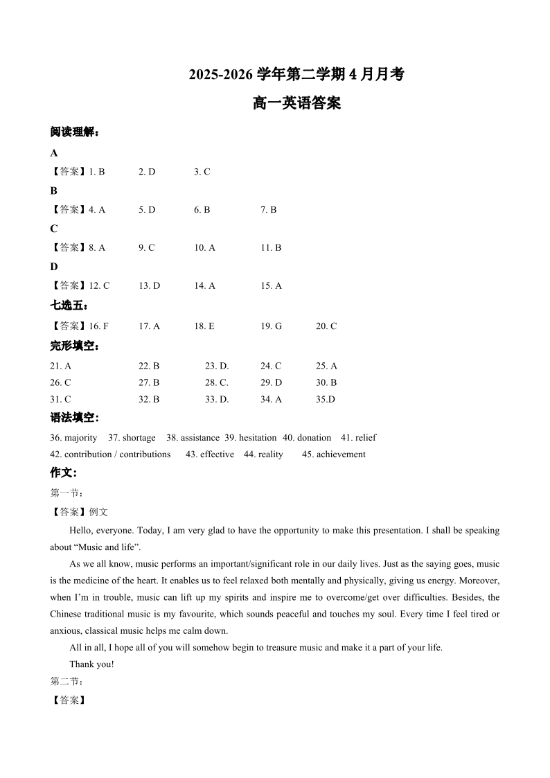 山西省晋城一中2025-2026学年高一下学期4月月考 英语答案.pdf