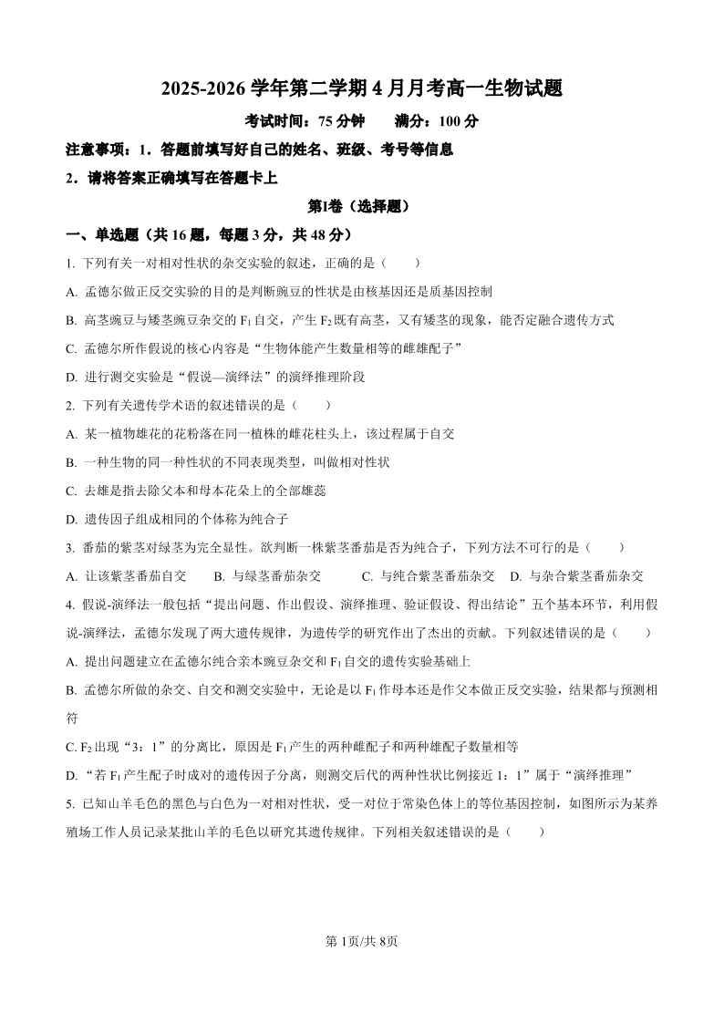 山西省晋城一中2025-2026学年高一下学期4月月考 生物.pdf