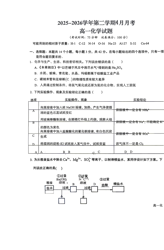山西省晋城一中2025-2026学年高一下学期4月月考 化学.pdf