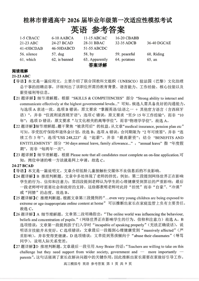 桂林市普通高中2026届毕业年级第一次适应性模拟考试 英语答案.pdf