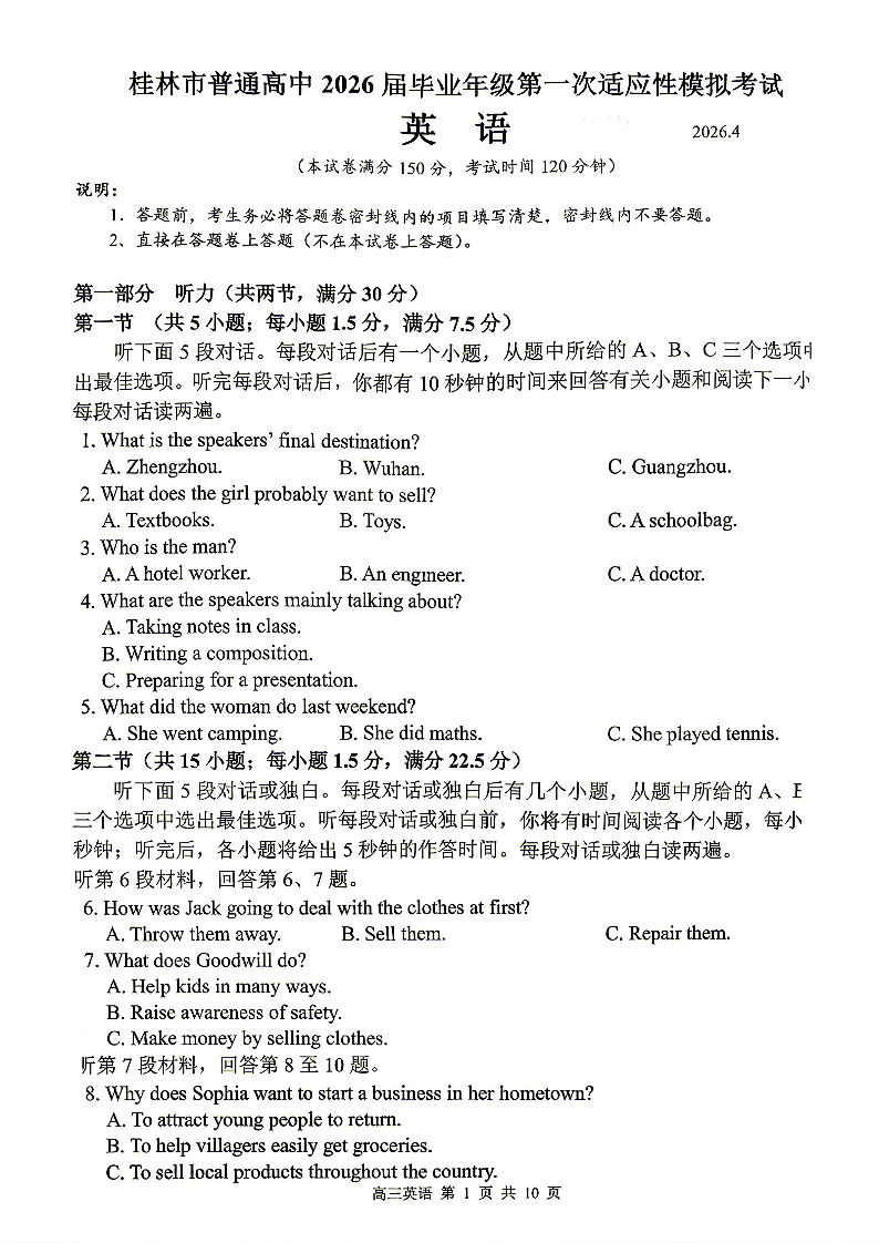 桂林市普通高中2026届毕业年级第一次适应性模拟考试 英语.pdf