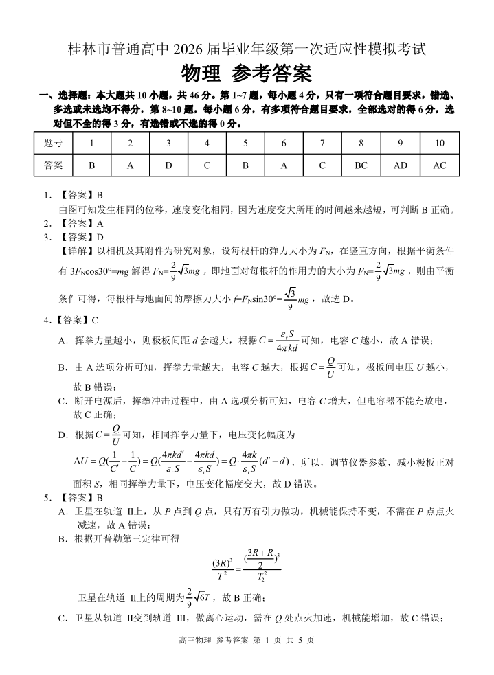 桂林市普通高中2026届毕业年级第一次适应性模拟考试 物理答案.pdf