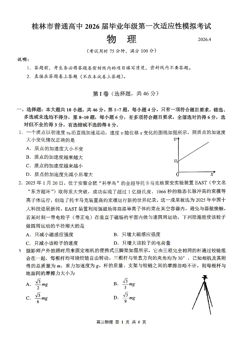 桂林市普通高中2026届毕业年级第一次适应性模拟考试 物理.pdf