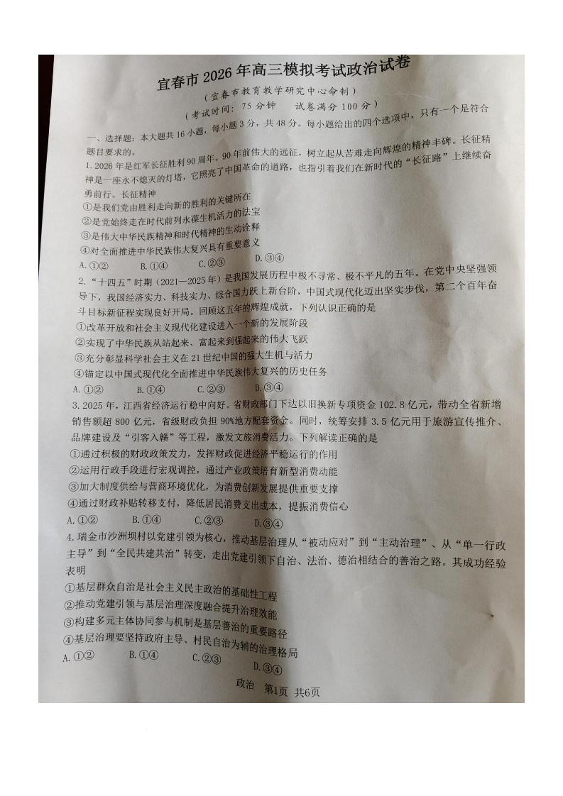 江西省宜春市2026年高三4月模拟考试 政治.docx
