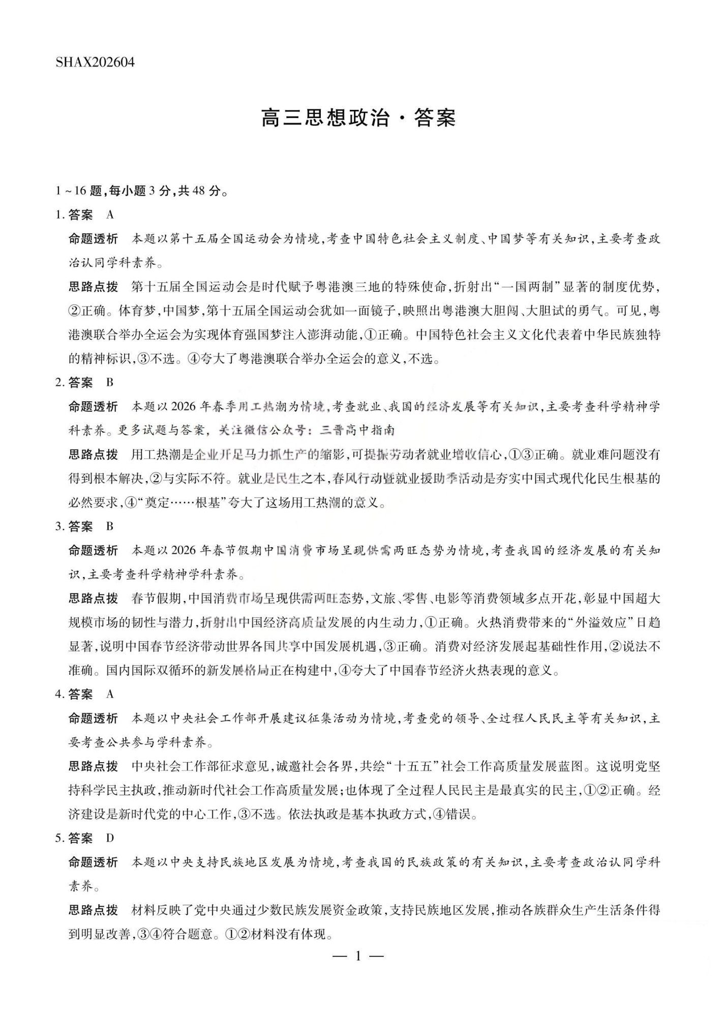 山西省2026届高三天一小高考素质评价(五)政治答案.pdf