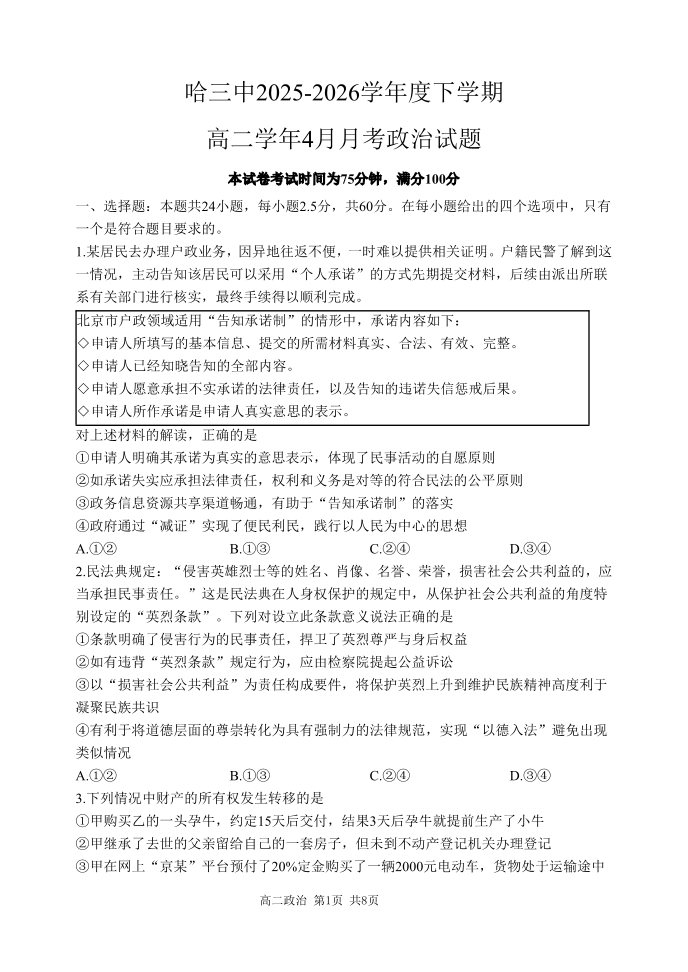 哈三中2025-2026学年度下学期高二学年4月月考 政治.pdf