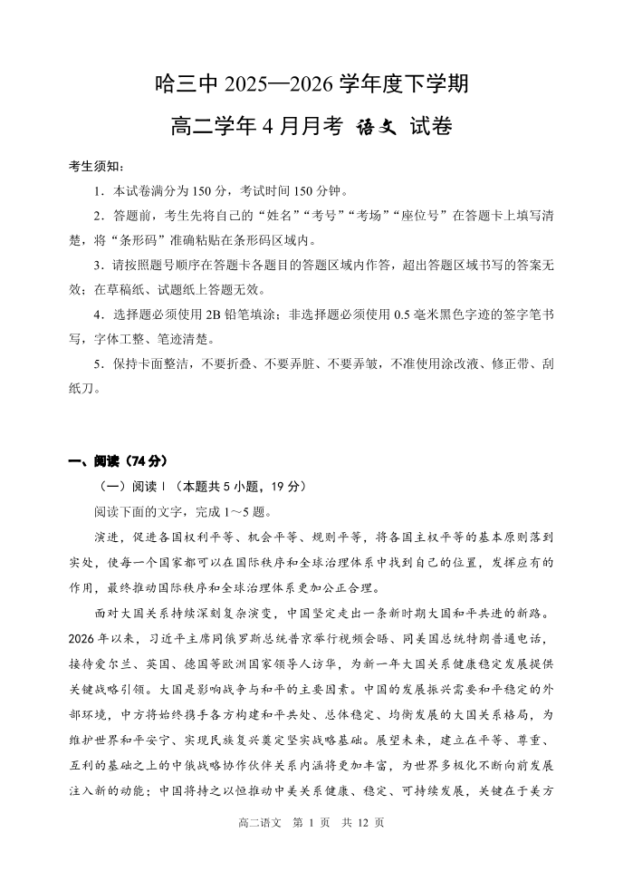 哈三中2025-2026学年度下学期高二学年4月月考 语文.pdf