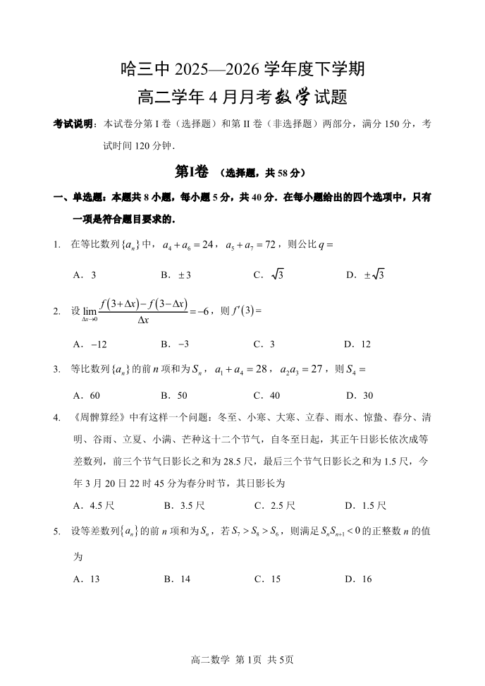哈三中2025-2026学年度下学期高二学年4月月考 数学.pdf