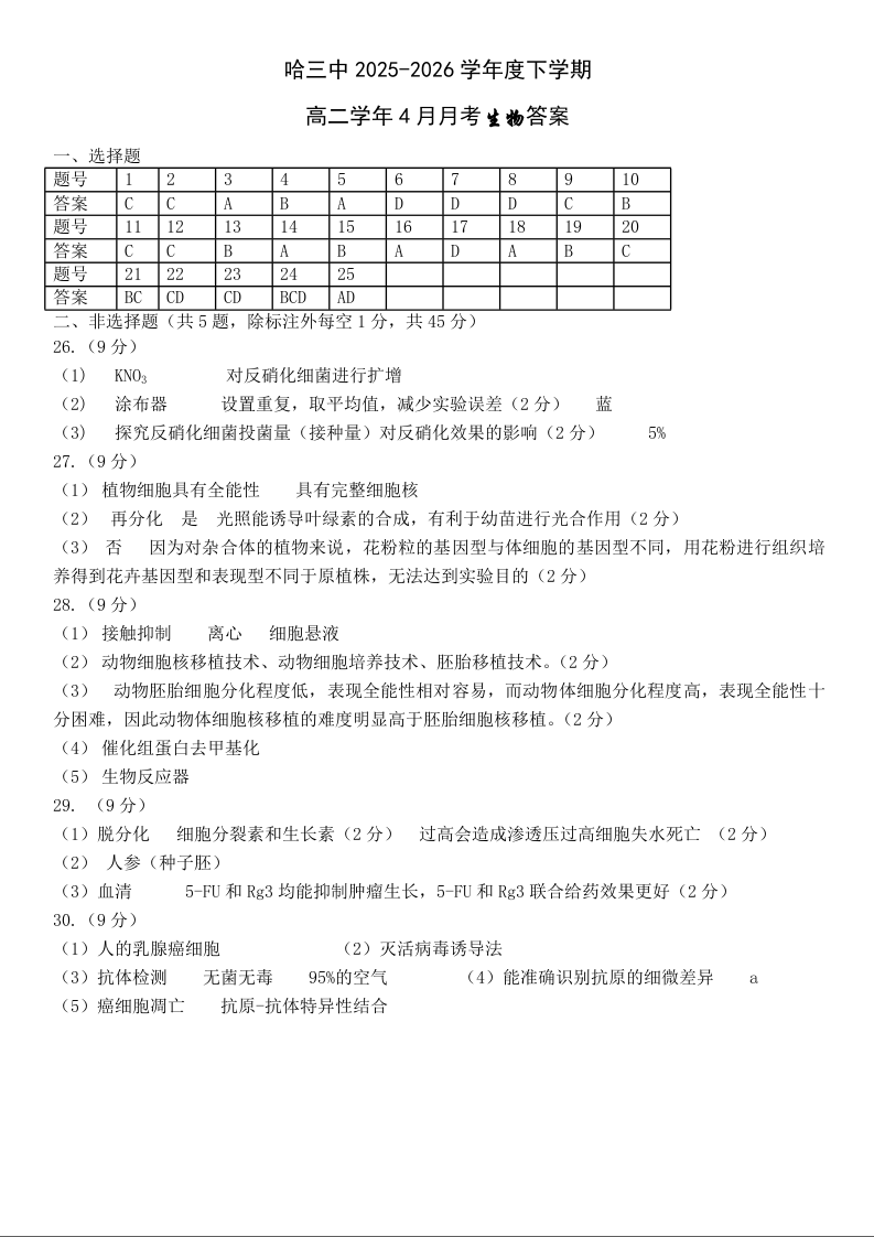 哈三中2025-2026学年度下学期高二学年4月月考 生物答案.docx