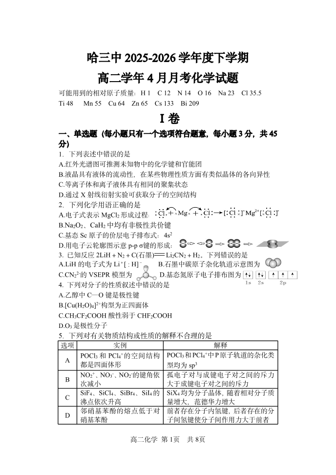 哈三中2025-2026学年度下学期高二学年4月月考 化学.pdf