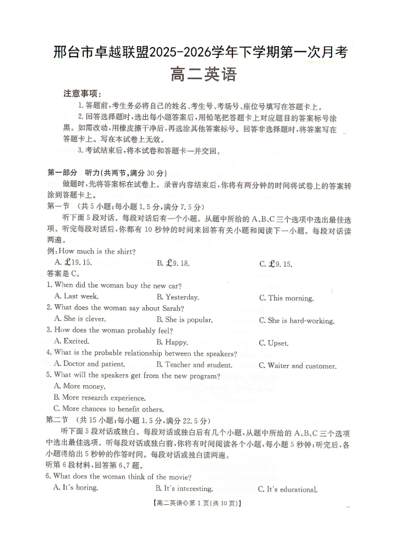 河北省邢台市卓越联盟2025-2026学年下学期高二年级第一次月考 英语.docx