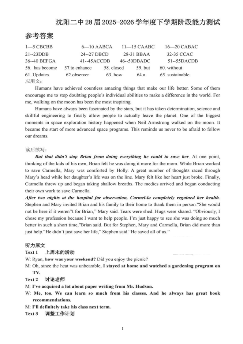 辽宁省沈阳二中2025-2026学年度高一年级下学期阶段能力测试 英语答案.pdf