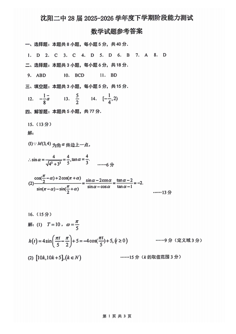 辽宁省沈阳二中2025-2026学年度高一年级下学期阶段能力测试 数学答案.pdf