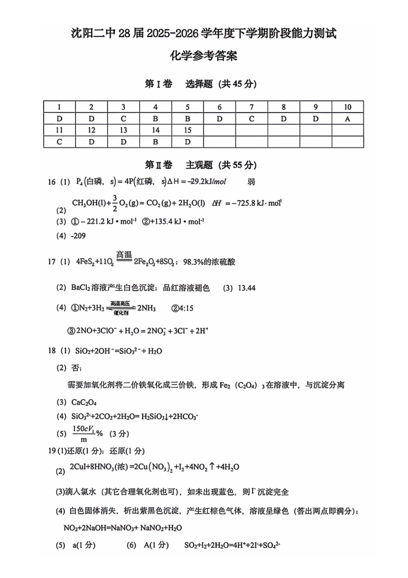 辽宁省沈阳二中2025-2026学年度高一年级下学期阶段能力测试 化学答案.pdf