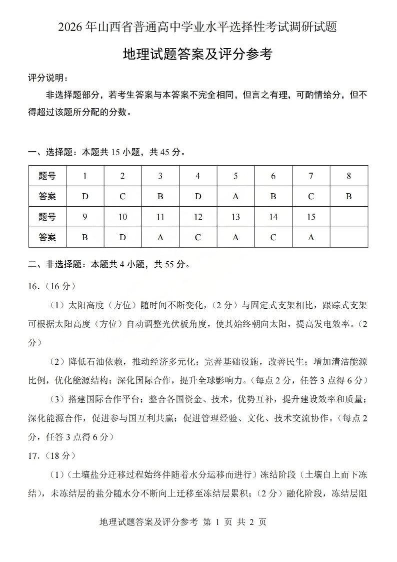 2026年山西省普通高中学业水平选择性考试调研试题 地理答案.pdf