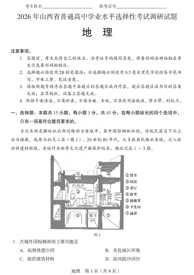 2026年山西省普通高中学业水平选择性考试调研试题 地理.pdf