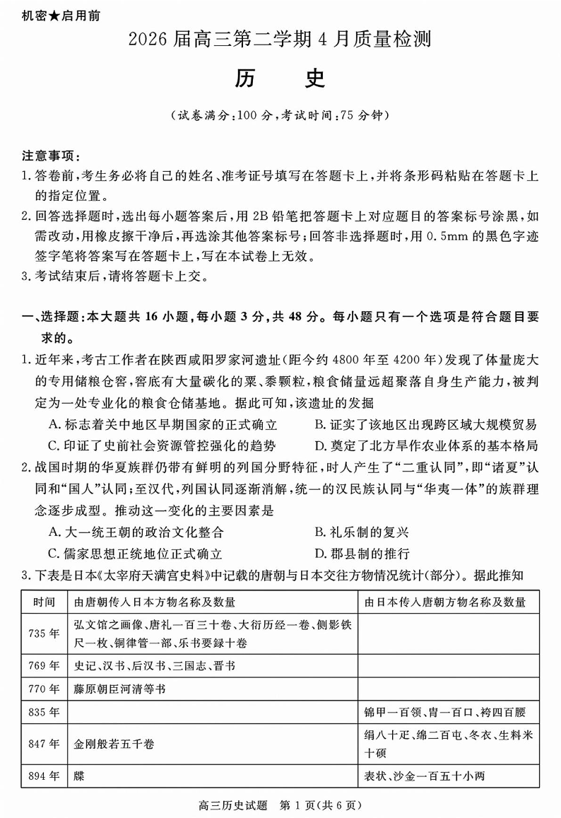 安徽华师联盟2026届高三第二学期4月质量检测 历史试题(含答案).pdf