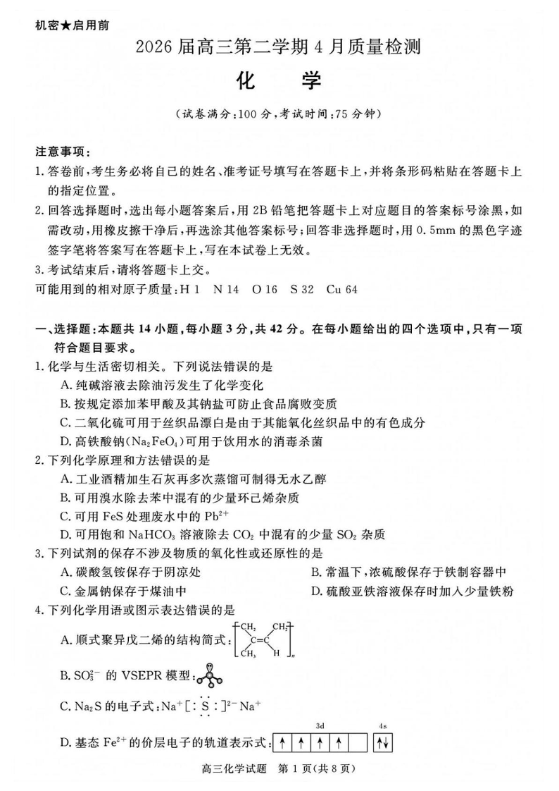 安徽华师联盟2026届高三第二学期4月质量检测 化学试题(含答案).pdf