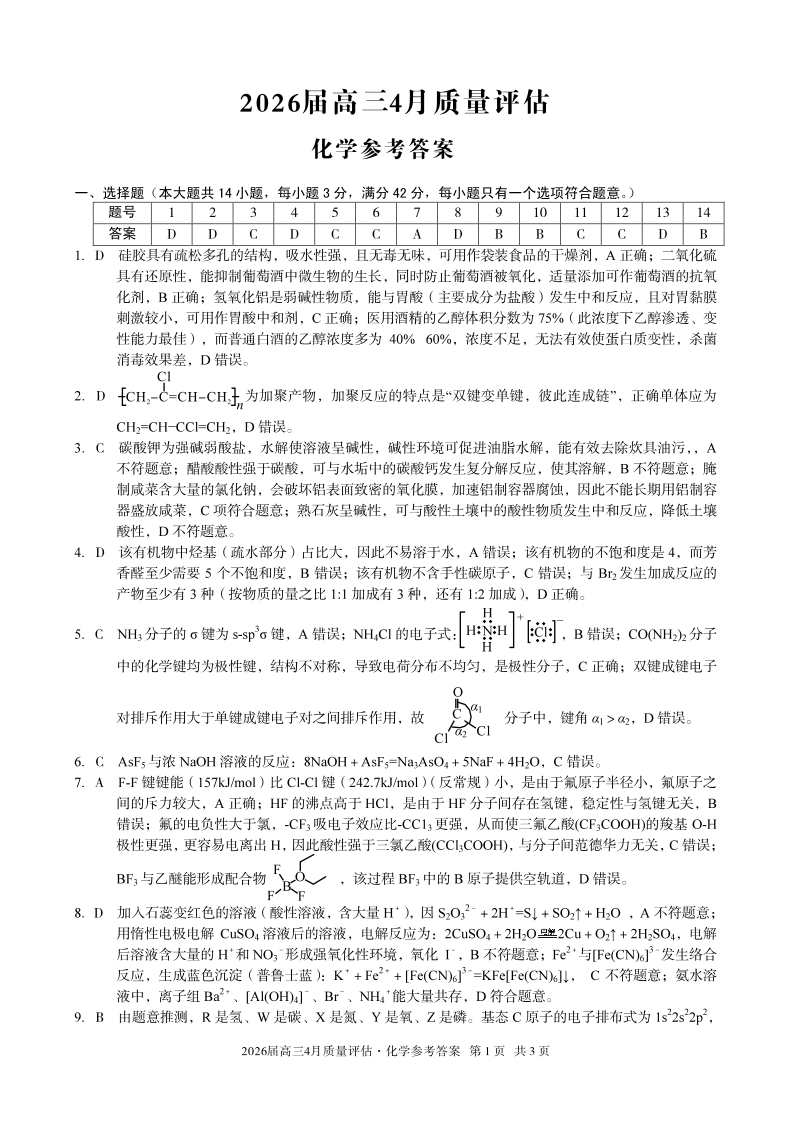 安徽省1号卷A10联盟2026届高三4月质量评估 化学答案.pdf