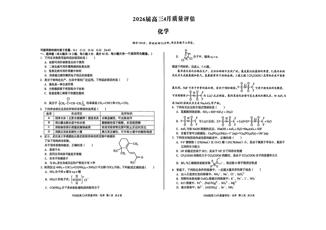 安徽省1号卷A10联盟2026届高三4月质量评估 化学.pdf