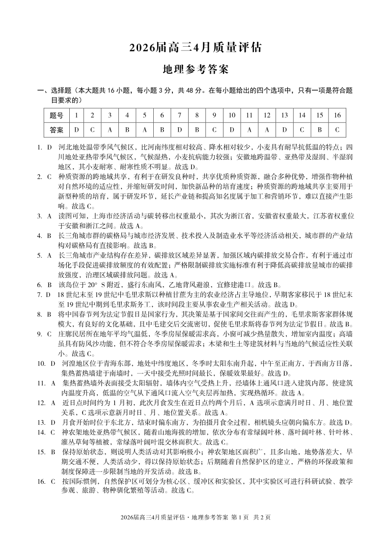 安徽省1号卷A10联盟2026届高三4月质量评估 地理答案.pdf