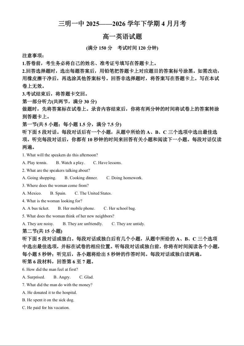 福建省三明市重点校2025-2026学年高一下学期4月月考 英语.docx