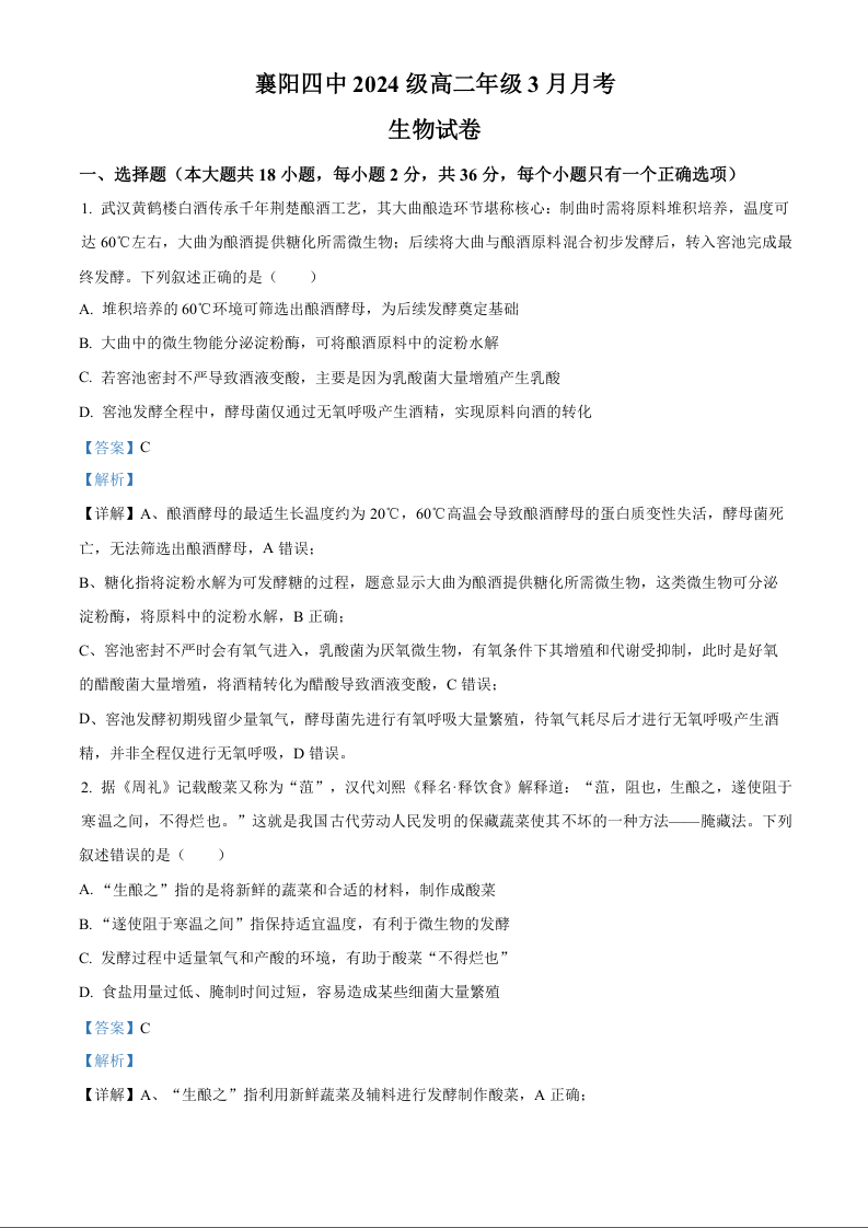 湖北省襄阳市襄阳四中2024级高二下学期三月月考 生物答案.docx