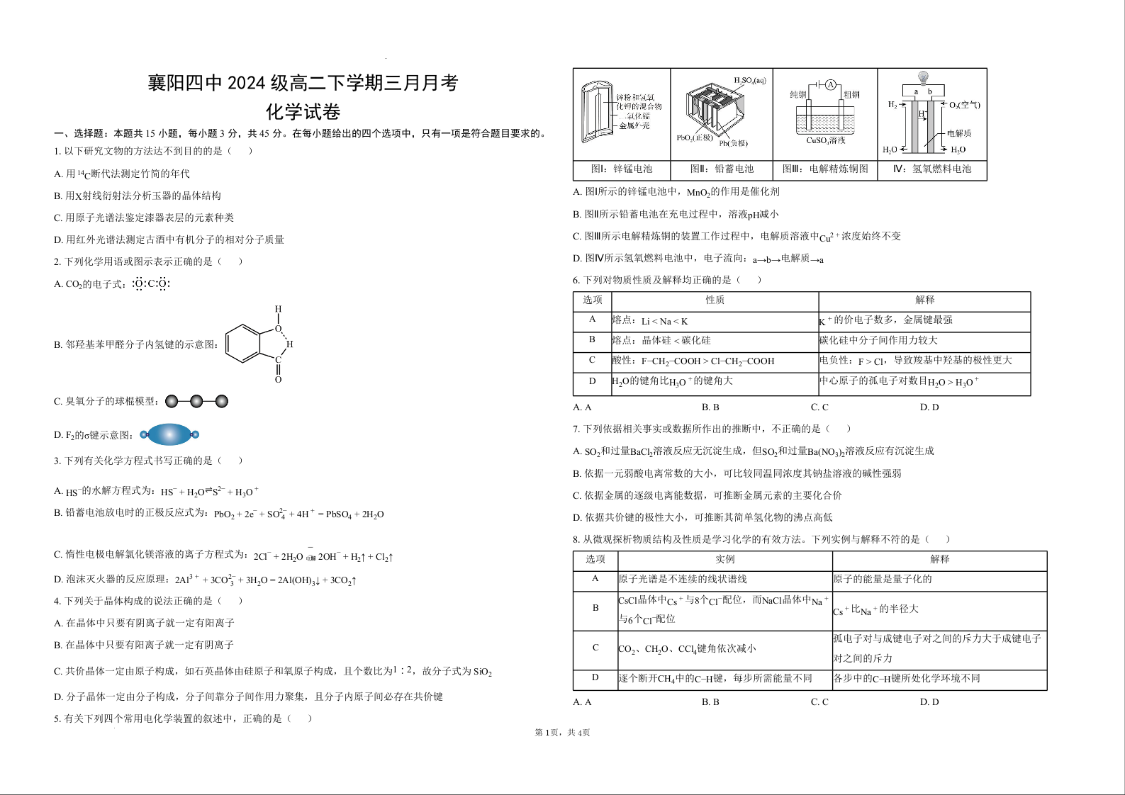 湖北省襄阳市襄阳四中2024级高二下学期三月月考 化学.docx