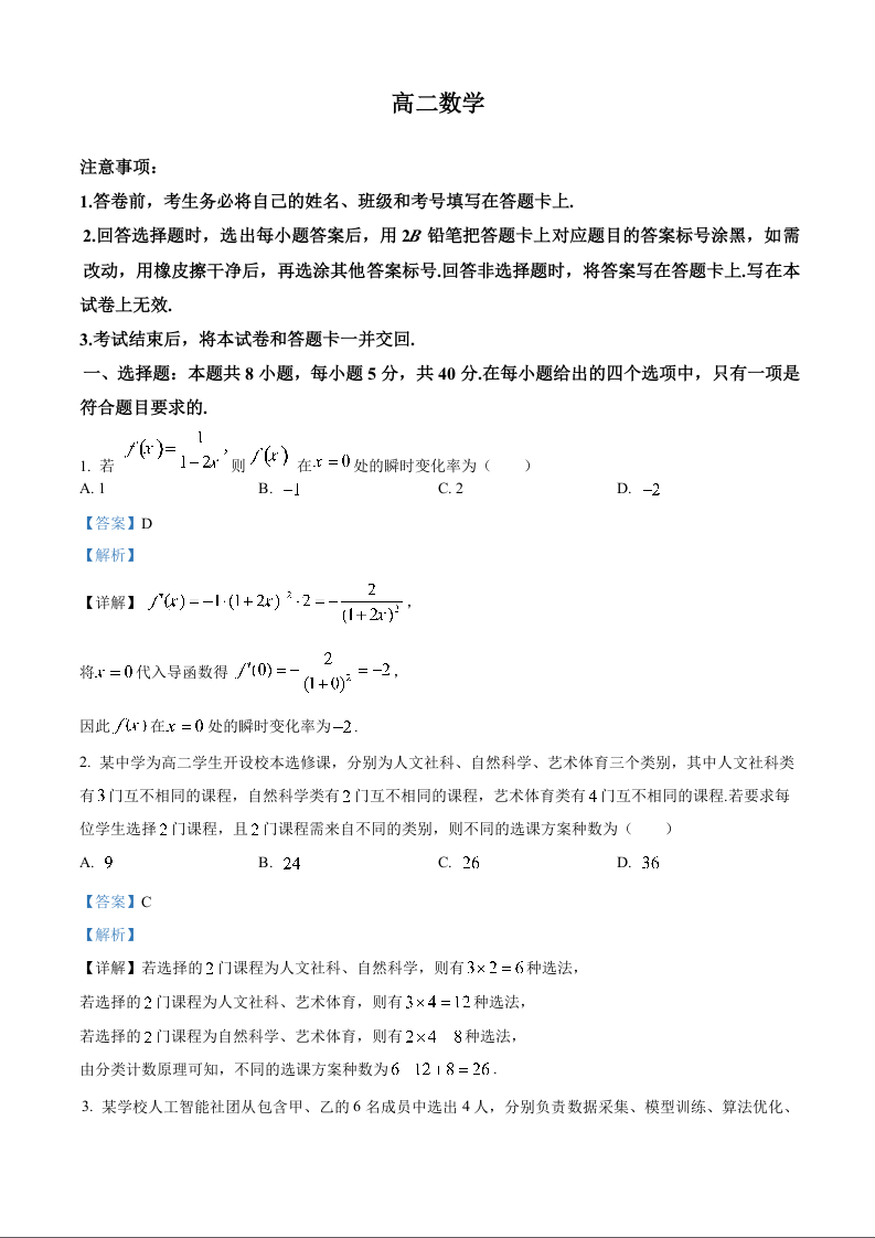 河北省定州中学2025-2026学年高二下学期阶段检测 数学答案.docx