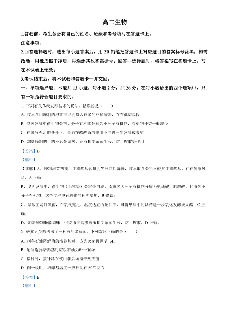 河北省定州中学2025-2026学年高二下学期阶段检测 生物答案.docx