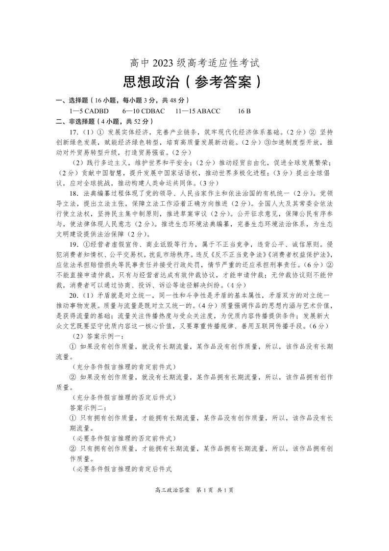 资阳市高中2023级高考适应性考试 政治答案.pdf