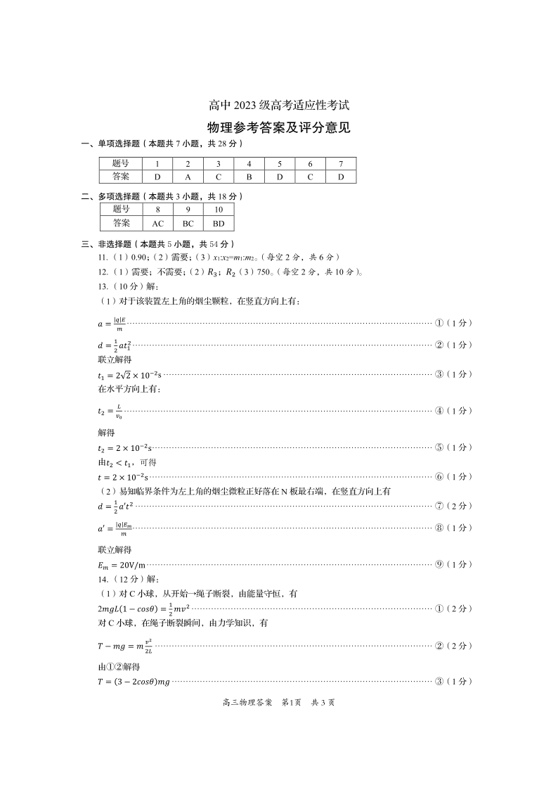 资阳市高中2023级高考适应性考试 物理答案.pdf