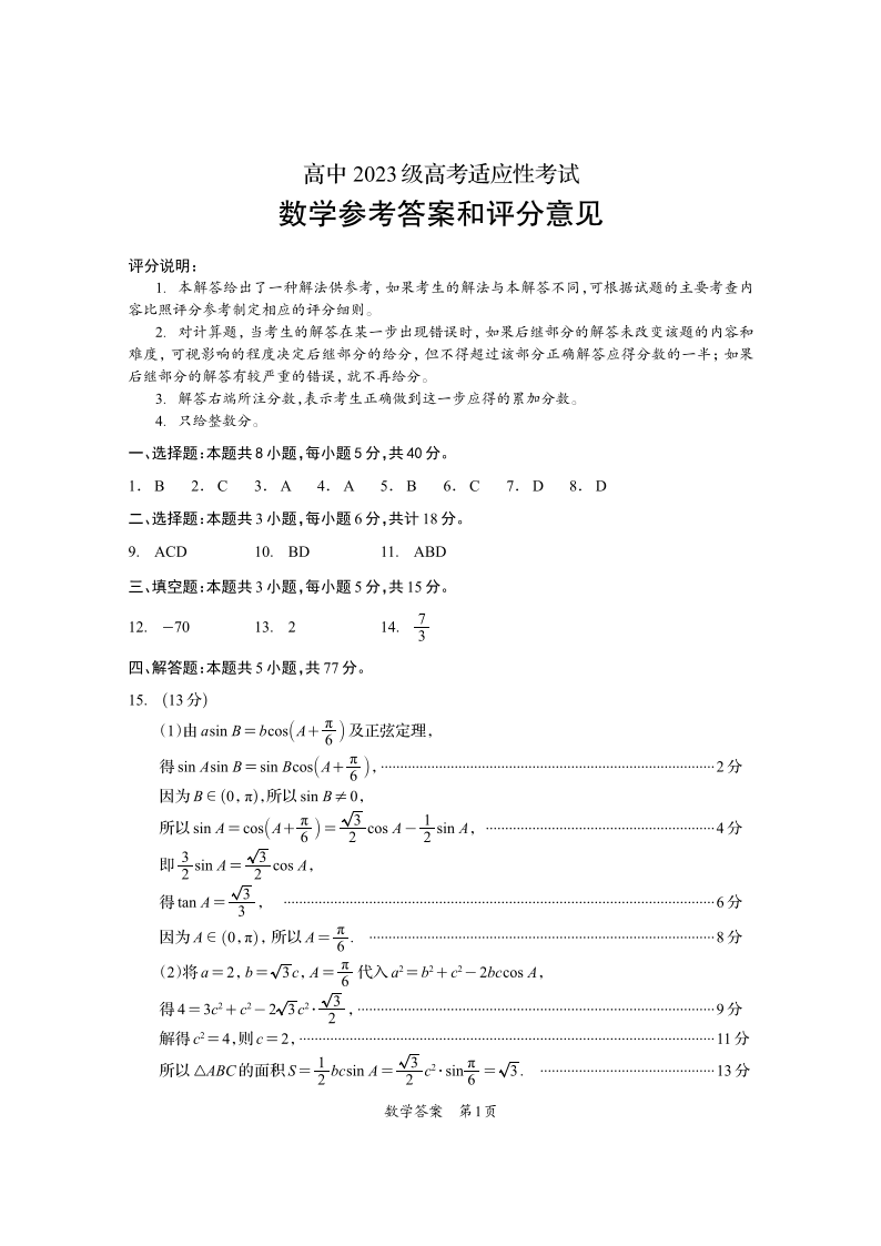 资阳市高中2023级高考适应性考试 数学答案.pdf